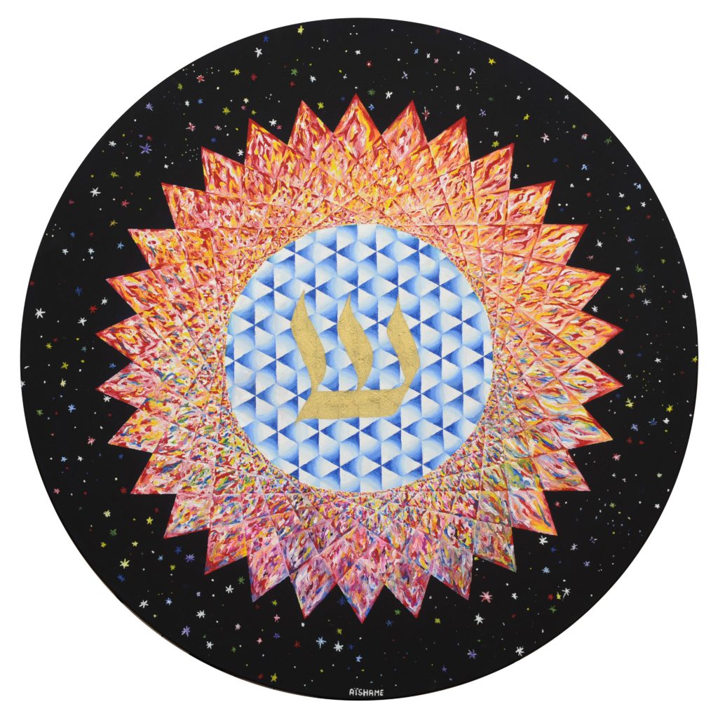 La couleur de Shin est celle du feu purificateur.  Sa valeur 300 est géométriquement illustrée par une Étoile à 30 pointes qui se croisent à toutes les 10.  Ce qui fait 30 X 10 = 300. On peut reconnaître un torus dans sa  structure géométrique.  Au centre, le bleu représente notre diamant intérieur. On y observe de nombreux hexagones et cubes de Métatron que l’on voient aussi dans l’Étoile Fleur de vie Hébraïque. (Voir site : lepeintredesetoiles.ca)